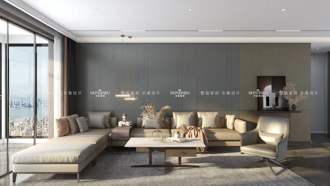 墙面的岩板中带着丝丝缕缕的轻柔纹理,宛如细水清流,不会过于单调,也不会过分杂乱。木饰面、金属、石材、棉麻等多变的材质衬托空间。地毯选择材质比较厚重的灰麻色调,在宽敞的客厅中界定了相对柔和的区域,传递着随性、沉稳而不失品质感的生活方式。