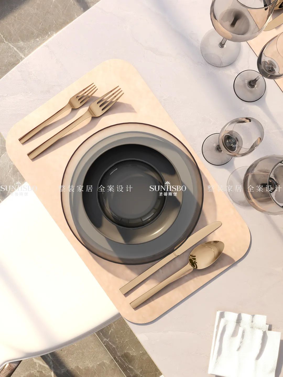 餐厅的设计采用整墙定制的餐边柜,高级灰让空间调性瞬间得到提升,半透明的玻璃展示区,营造了多样的空间和充满极简艺术气息的生活体验。